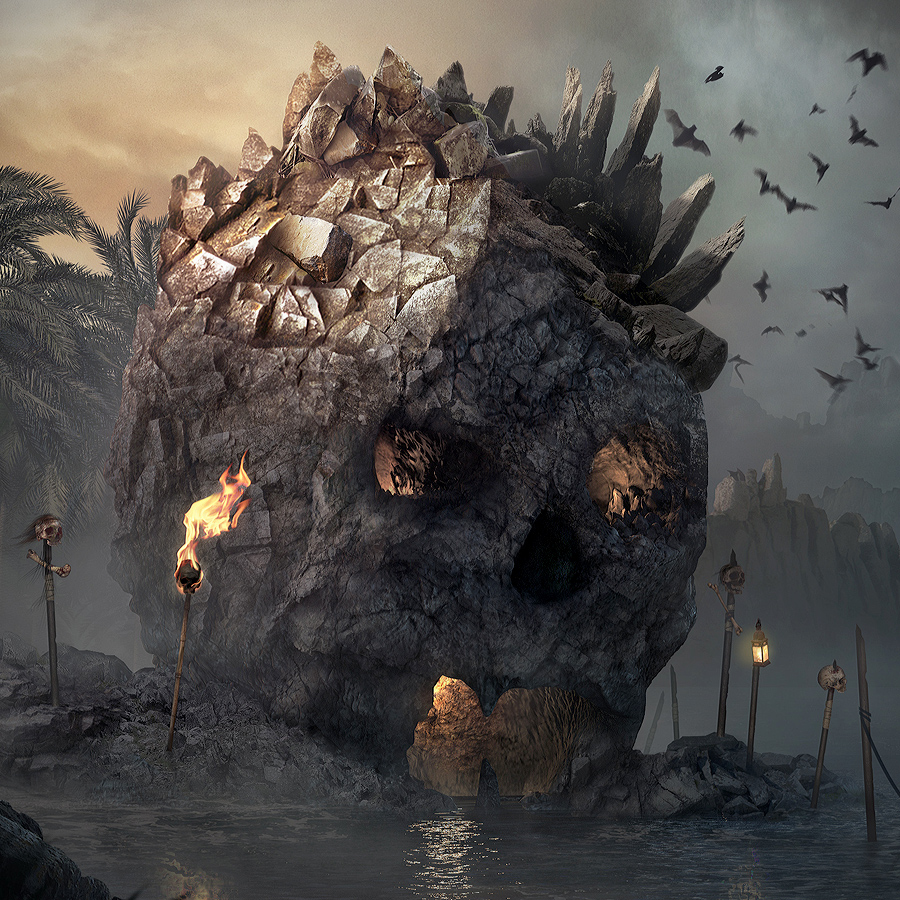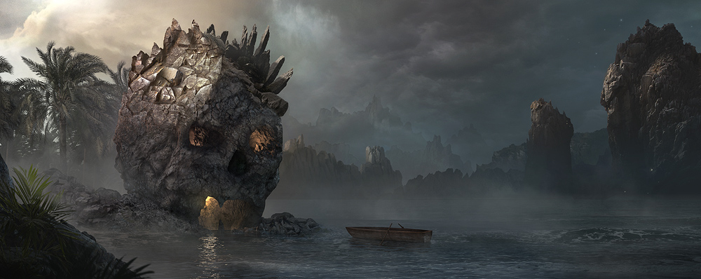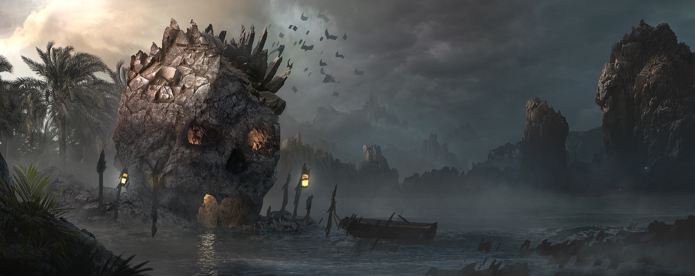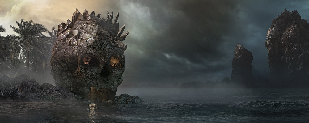 Here are my steps inside Photoshop. Just lots of matte painting here. Oh and the first thing I noticed was that my composition was suffering and I had to make it wider. The skull just felt squashed. Never be afraid to do this.